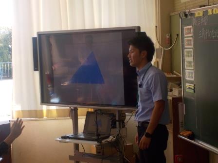3年生算数科では少人数担当の堤先生が授業を行いました。今回は学習者用デジタル教科書のコンテンツを活用して、三角形を仲間分けする活動でした。デジタルとアナログの関連がしっかりとなされており、何より教材・教具の準備がとてもすばらしかったです。そのため子どもたちも意欲的に学習に取り組み、あっという間の45分間となりました。
