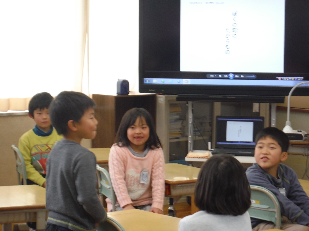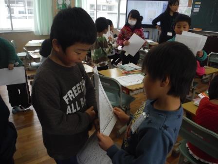 研究発表会は終わりましたが1月も小研ウィークを実施し、さらに研究を「進化・深化」させている山田小学校です。1年生国語科では、一人一人が書いたお手紙を友だち同士で読み合い、意見を交流する学習でした。手紙を届ける相手をしっかり意識して、文字の丁寧さや言葉遣いなどに気を配っていきました。1年生の子どもたちはみんなとても字が丁寧で、びっくりしたところでした。友だちとの意見交流にもすっかり慣れ、意欲的に学び合う姿が見られました。