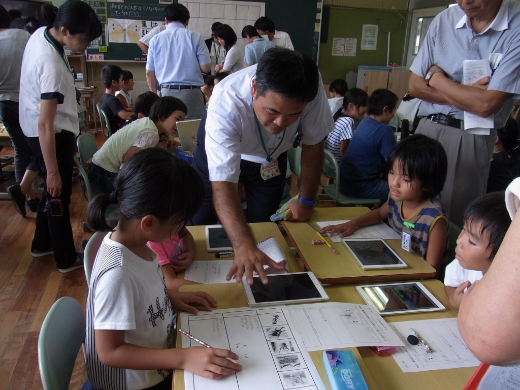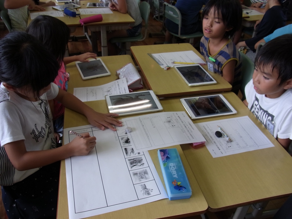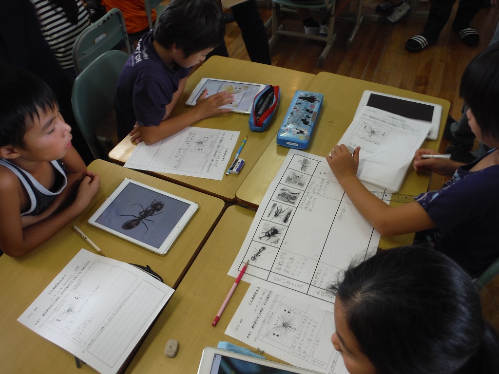 子どもたちは、タブレットの拡大機能を上手に活用ながら、昆虫の細部までしっかりと観察し、気づきを伝え合うことができました。また、タブレットと同じ写真を電子黒板にも写し、自分の考えを堂々と発表することもできていました。