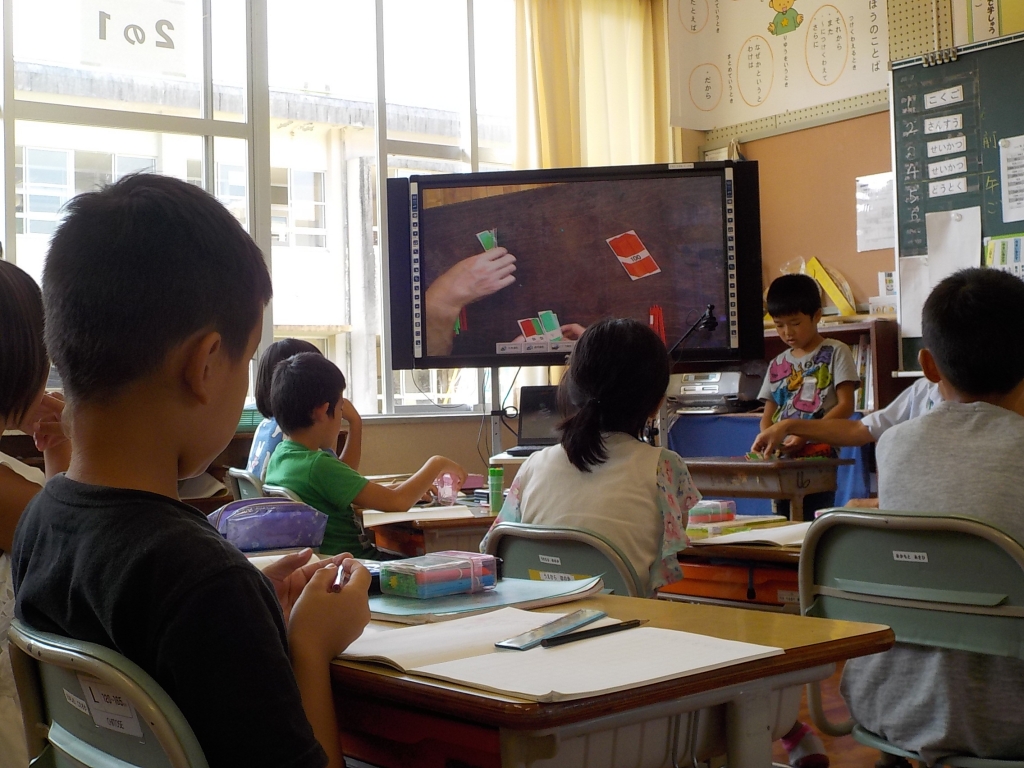 算数の学習では、書画カメラと電子黒板を用いて、「操作活動の様子」や「自分の考えを発表する根拠」として活用しています。