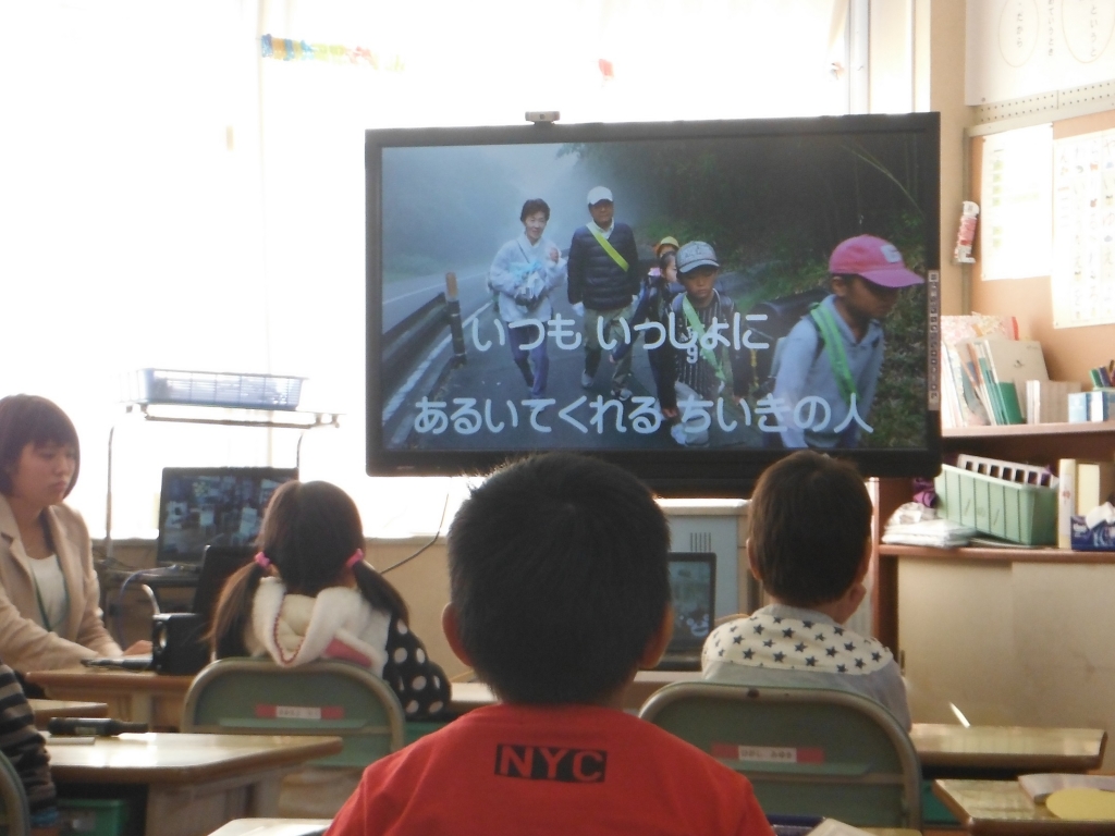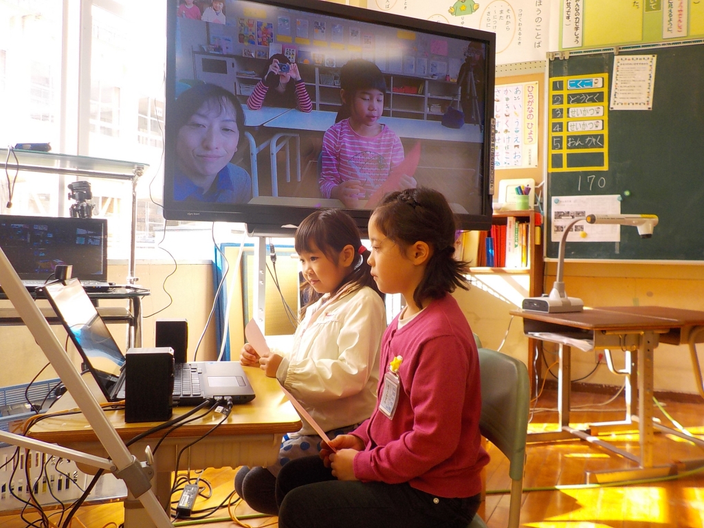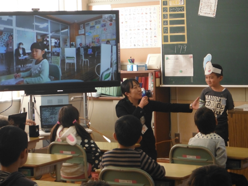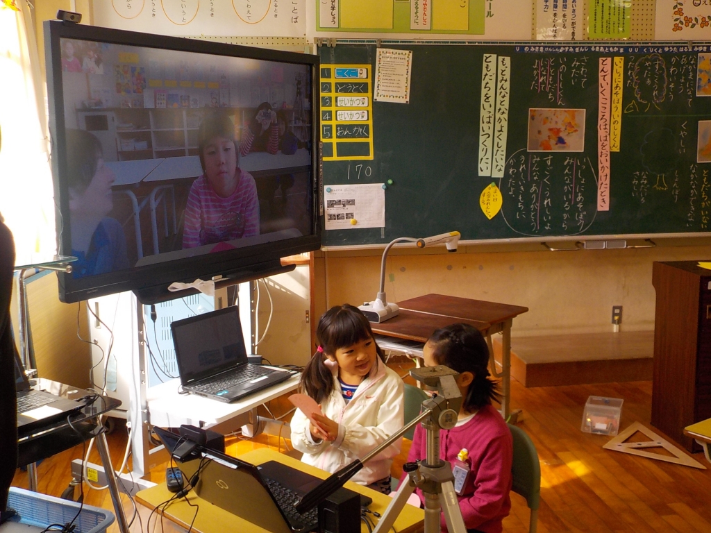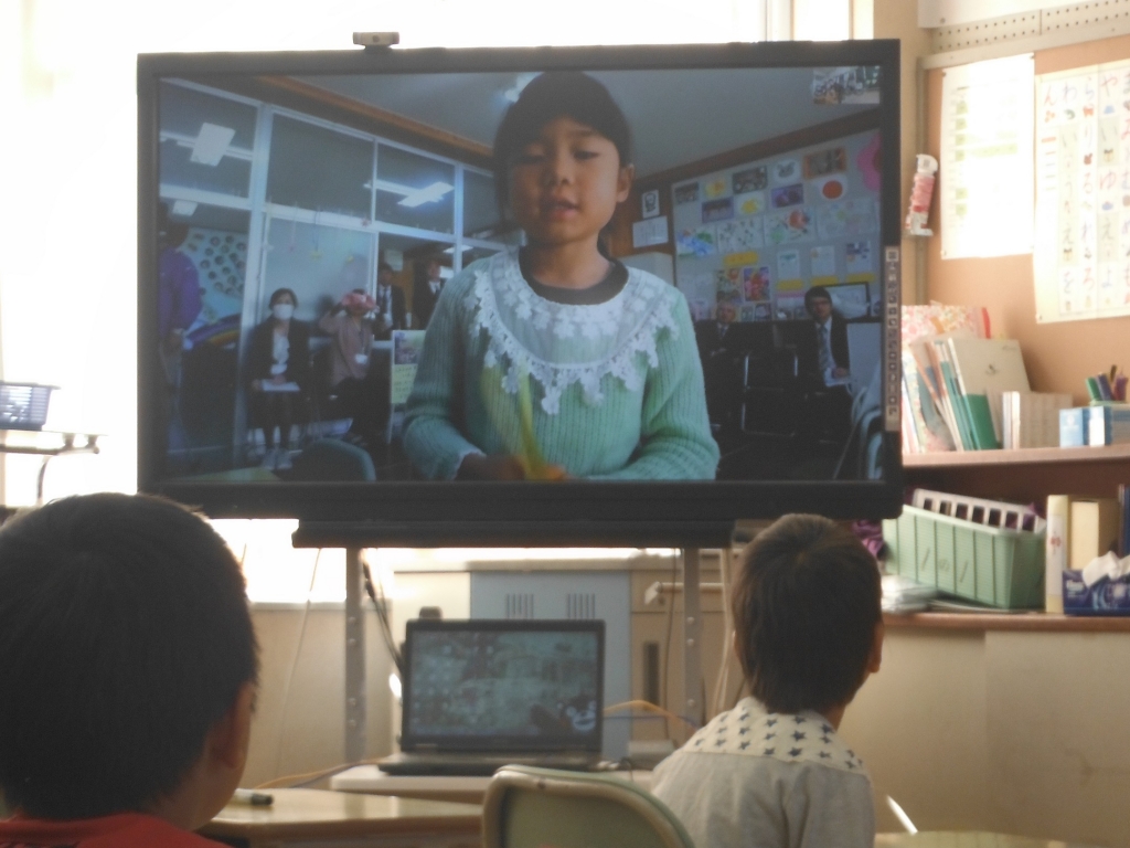 グループ活動や発表場面では、パソコンの画面上だけではなく、電子黒板にも万江小学校の友だちを映したことで、より臨場感のある展開になりました。