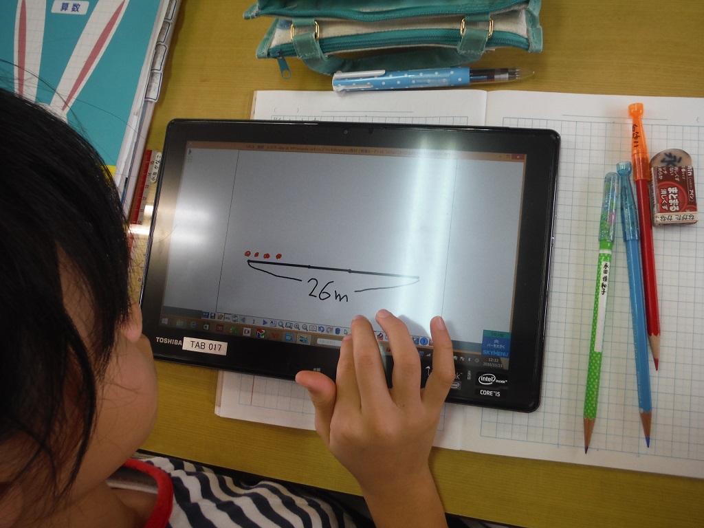 10mの線をつくるのに、なぜ11人必要であることを、タブレットを使って考えました。