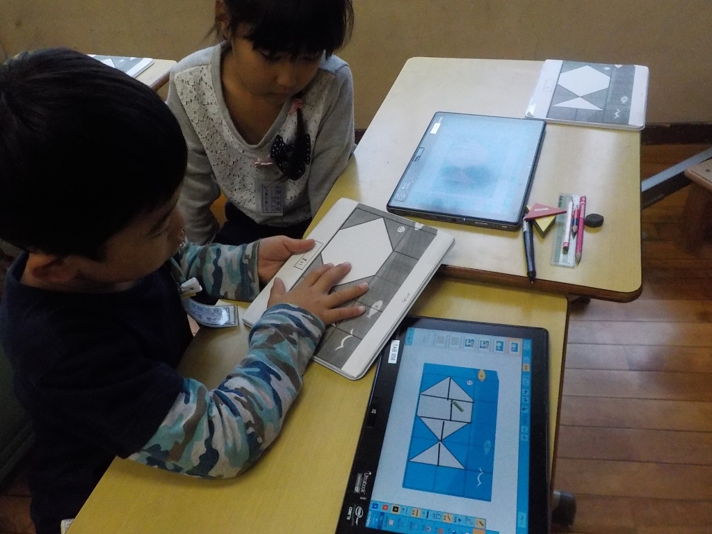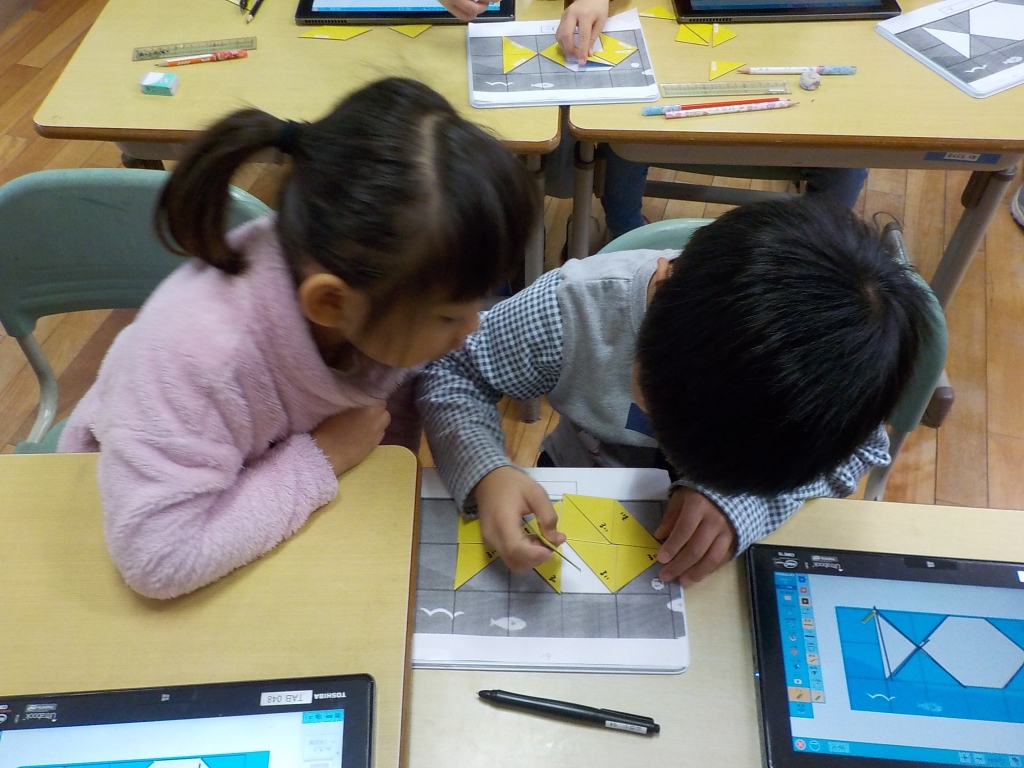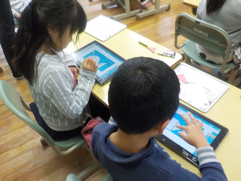 今回の授業では、タブレットを使って、図形に直線を引いたり、自分の考えを説明したりしました。
