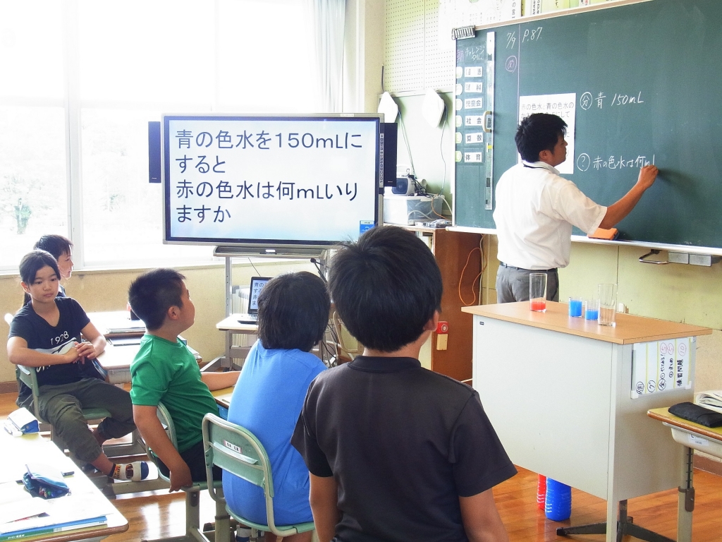 公開した授業は6年算数「比とその利用」で、本時のめあては「比と一方の量から、もう一方の量の求め方を考えよう」でした。