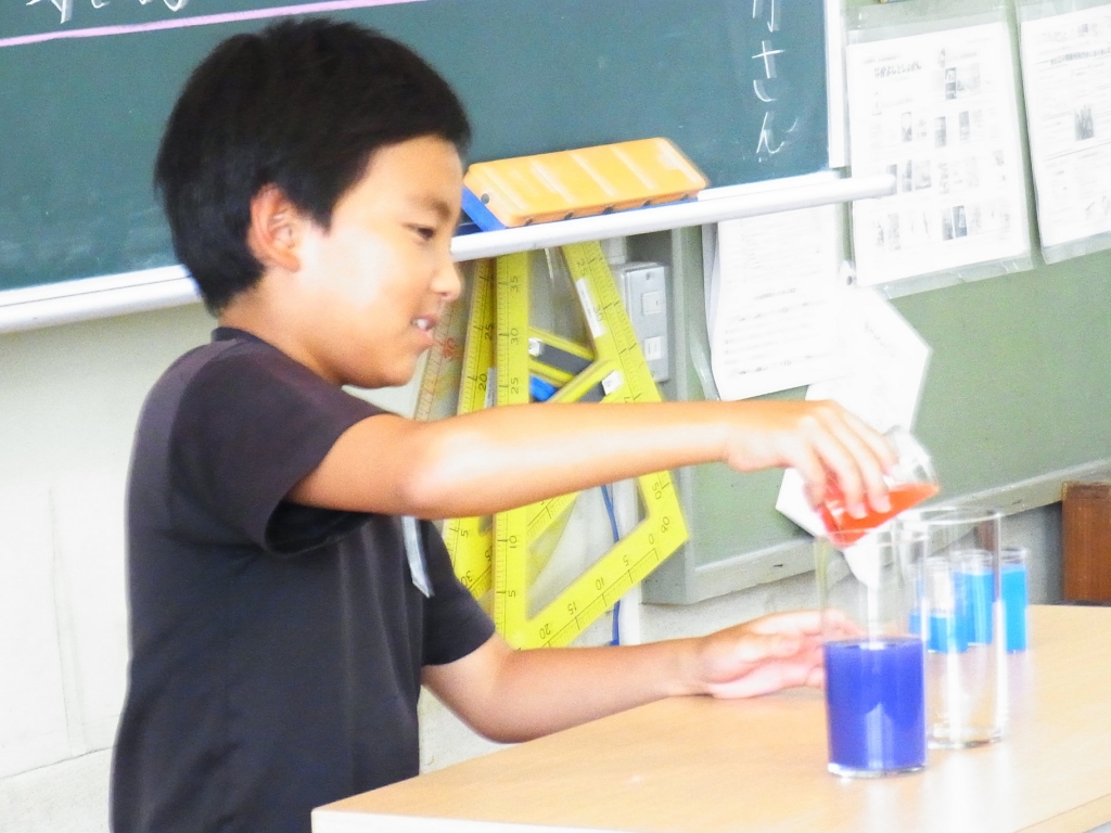最後には、実際に色水を混ぜてみて、自分たちが考えて求めた答えが正しい比だったのかを確認しました。