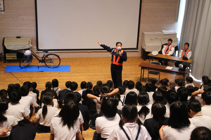 山鹿警察署から1名。交通指導隊の方が2名来られました。ヘルメット着用の大切さ、交通事故にならないために一旦停止をし、安全を確認することの大切さを教えてもらいました。