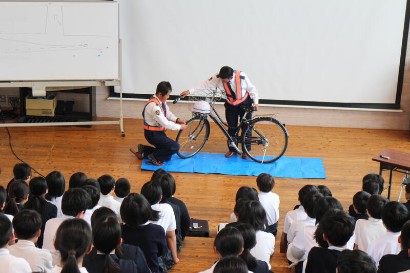 交通指導隊の方からは、自転車点検について教えてもらいました。①ハンドルがまっすぐになっているか②ブレーキの点検③タイヤの空気の点検 3つのポイントが大切とのことでした。