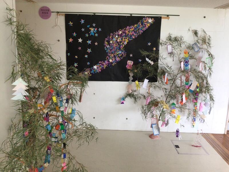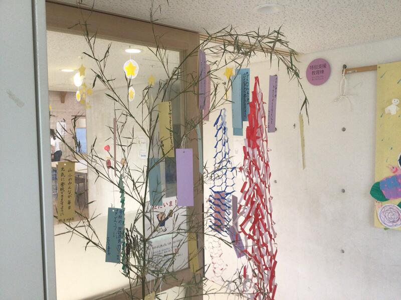 校内のあちらこちらに、願いを書いた短冊が付けられた笹竹が飾られています。