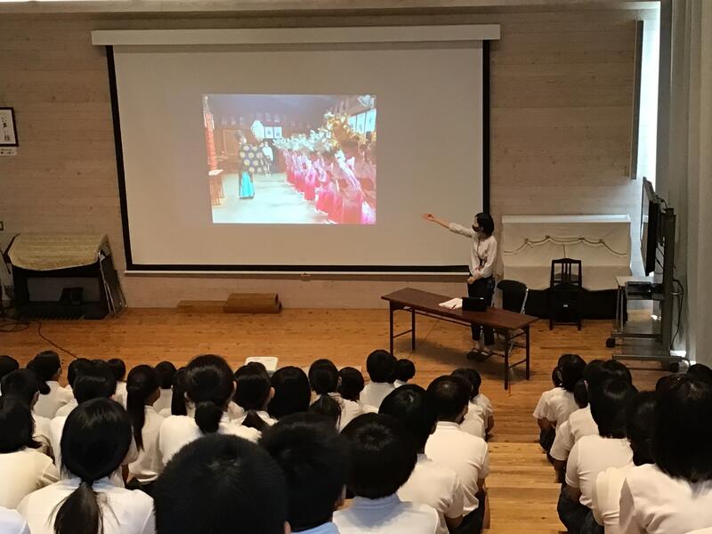 6月27日(木)、山鹿灯籠踊り保存会から5名の方に来校いただき、全校児童を対象にした山鹿灯籠踊りの鑑賞会を行いました。よへほ節にあわせて、艶やかな浴衣姿で踊る様子に、見ている全てが踊りの世界に引き込まれました。子ども達からは銀と金の灯籠の違いや、後ろの帯に団扇を差している理由などの質問がありましたが、一段と山鹿灯籠踊りの奥深さを感じることができました。