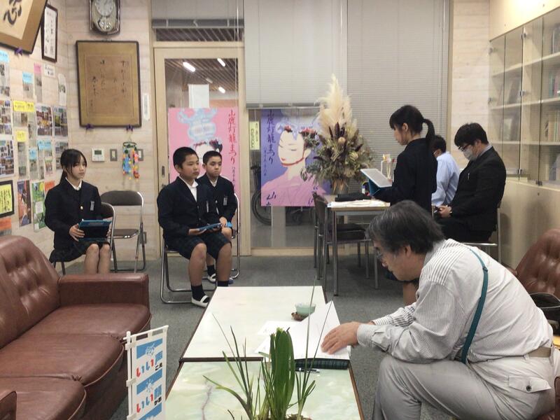 3年生は大宮神社の禰宜を務める杉谷さんに山鹿灯籠まつりの歴史、