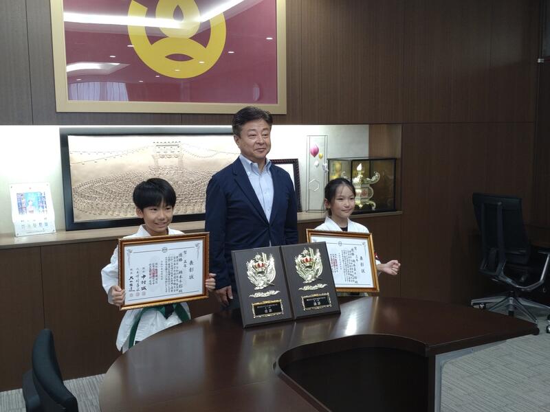 7月に行われた空手の全国大会で、5年生の橋本千影さん、3年生の橋本菜々桜さんがそれぞれの型の部で見事優勝しました。そこで9月25日(水)に早田市長にその結果を報告に行きました。早田市長からはこれからも努力を続