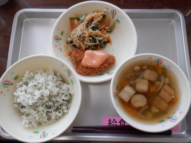 今日の給食は菜めし、かきたま汁、いかの天ぷら、きゅうりとわかめの酢の物、牛乳でした。