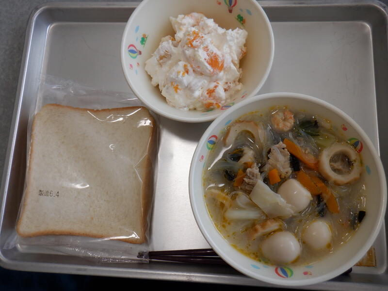 今日の給食はツナマヨ蒸しパン、肉団子と春雨のスープ、甘夏サラダ、牛乳でした。
