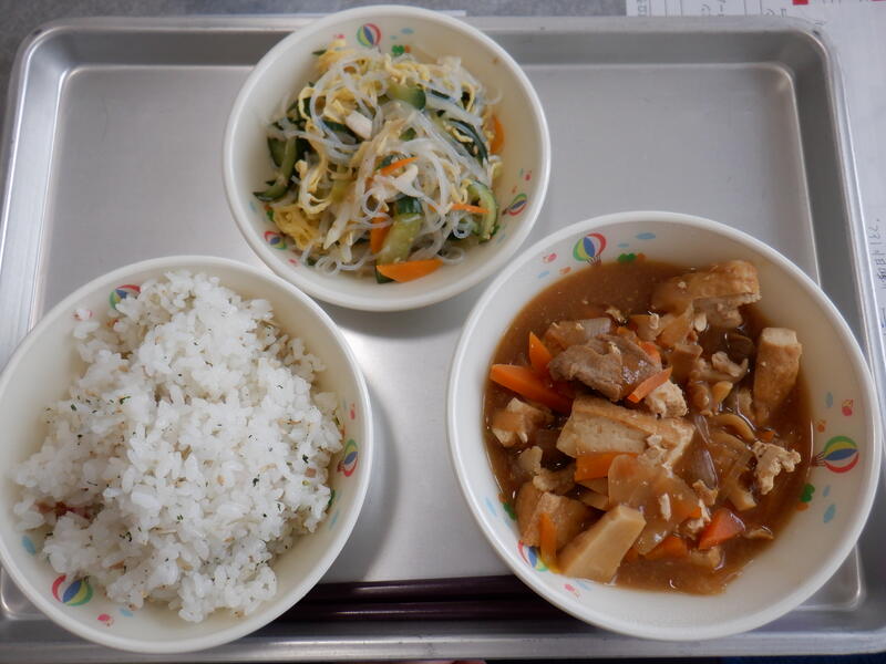 今日の給食は麦ごはん、肉じゃが、野菜の甘酢和え、手作りひじきふりかけ、牛乳でした。