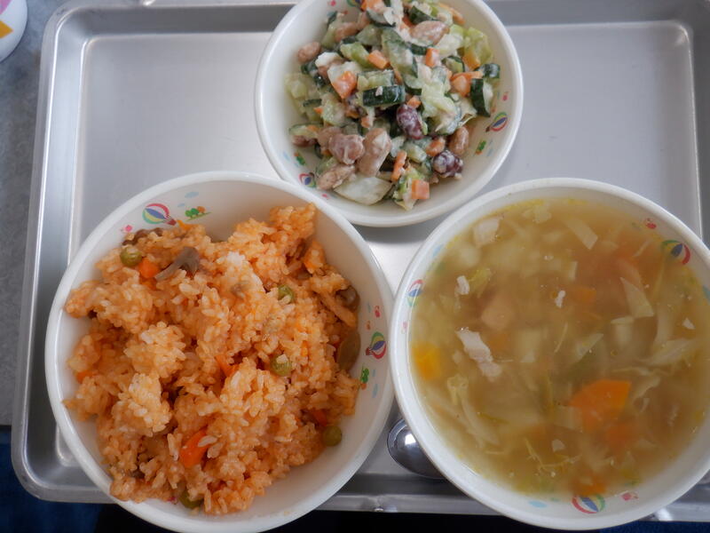 今日の給食はチキンライス、コーンスープ、れんこんサラダ、ハロウィンデザート、牛乳でした。