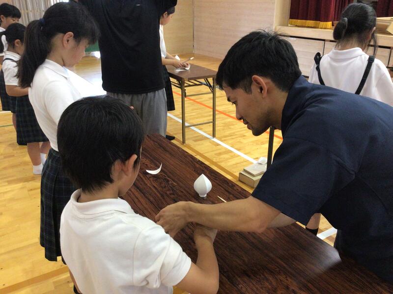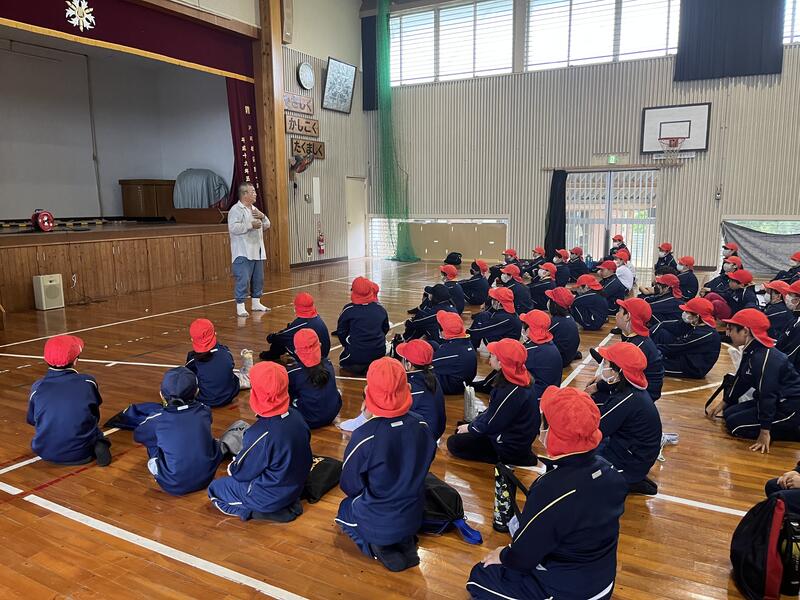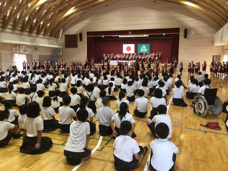 6月27日(木)、山鹿灯籠踊り保存会から5名の方に来校いただき、全校児童を対象にした山鹿灯籠踊りの鑑賞会を行いました。よへほ節にあわせて、艶やかな浴衣姿で踊る様子に、見ている全てが踊りの世界に引き込まれました。子ども達からは銀と金の灯籠の違いや、後ろの帯に団扇を差している理由などの質問がありましたが、一段と山鹿灯籠踊りの奥深さを感じることができました。