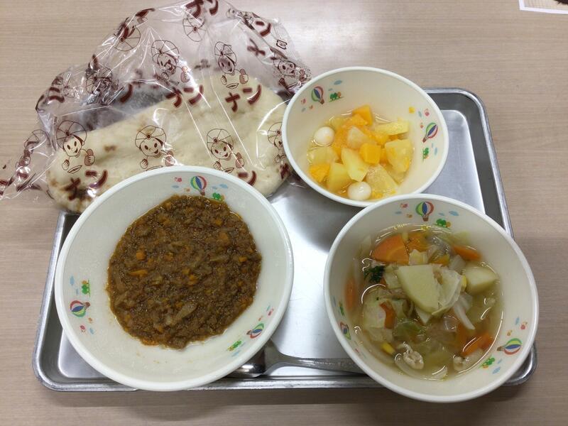 ◎今日の献立は「キーマカレー、ナン、フルーツ白玉、野菜スープ」美味しくてほっぺが落ちそうでした。本年度は食数が増えた給食室ですが、毎日毎日子供たちのために美味しい給食を作っていただき、本当にありがとうございます。