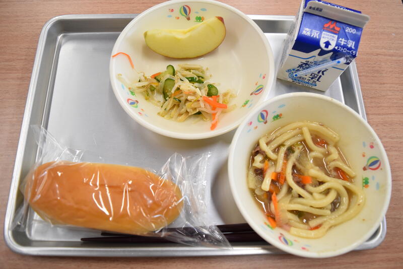 今日の給食は、ミルクパン、牛乳、肉うどん、もやしのアーモンドあえ、りんごでした。