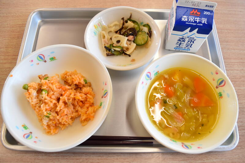 今日の給食は、チキンライス、牛乳、かぼちゃのスープ、れんこんサラダでした。