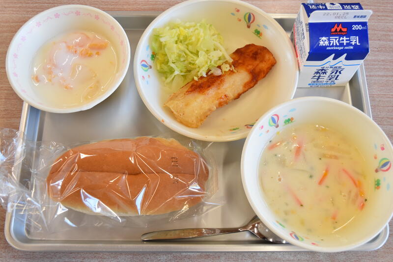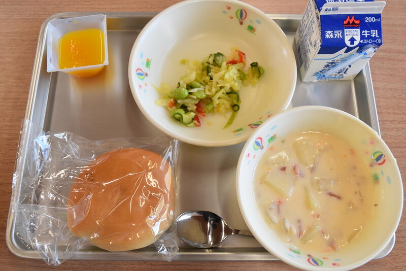 今日の給食は、丸パン、牛乳、白菜のクリーム煮、枝豆と豆腐のミンチカツ、たまごサラダでした。