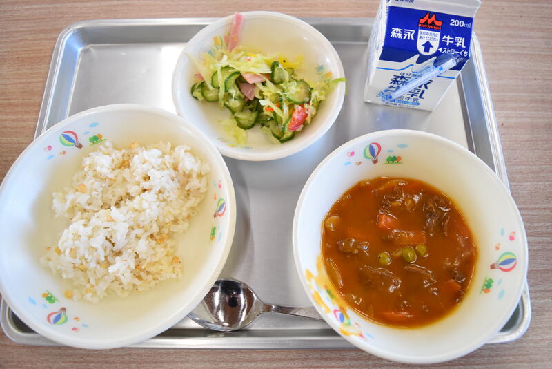 今日の給食は、麦ごはん、牛乳、冬野菜カレー、ひじきと枝豆のサラダでした。