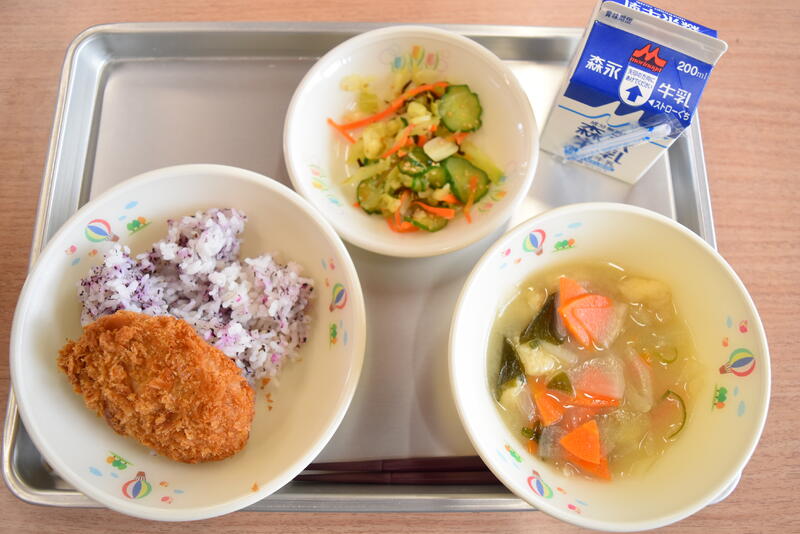 今日の給食は、ゆかりごはん、牛乳、大根のみそ汁、豚カツ、昆布あえでした。
