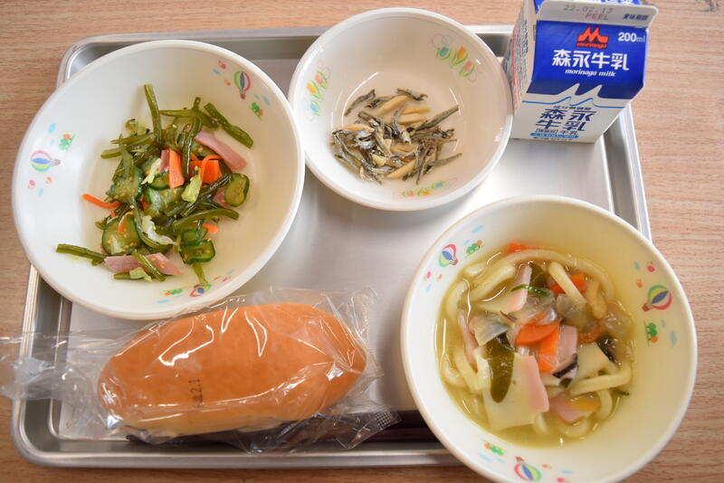 今日の給食は、コッペパン、牛乳、ごもくうどん、茎ワカメのサラダ、アーモンドフィッシュでした。