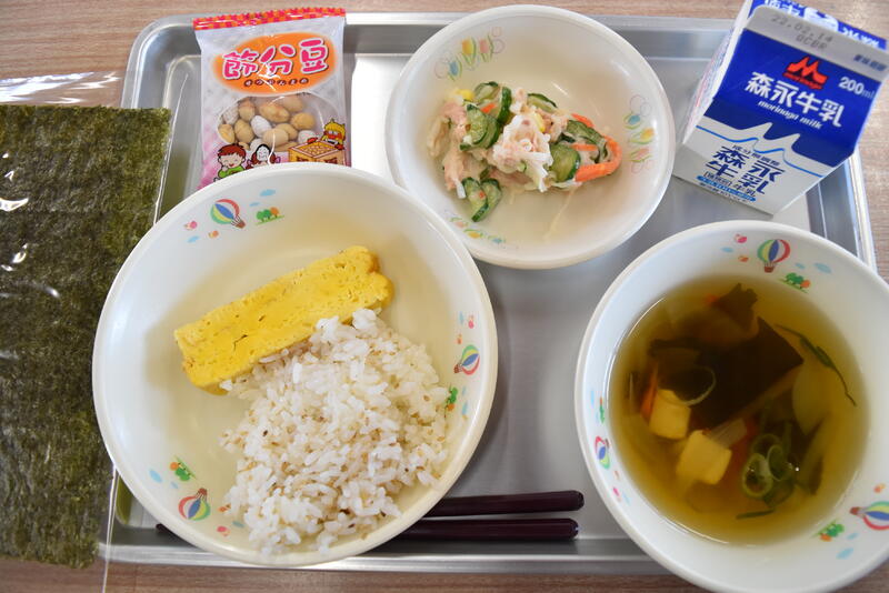 今日の給食は、セルフ手巻き寿司、牛乳、すまし汁、厚焼きたまご、のり、節分豆でした。