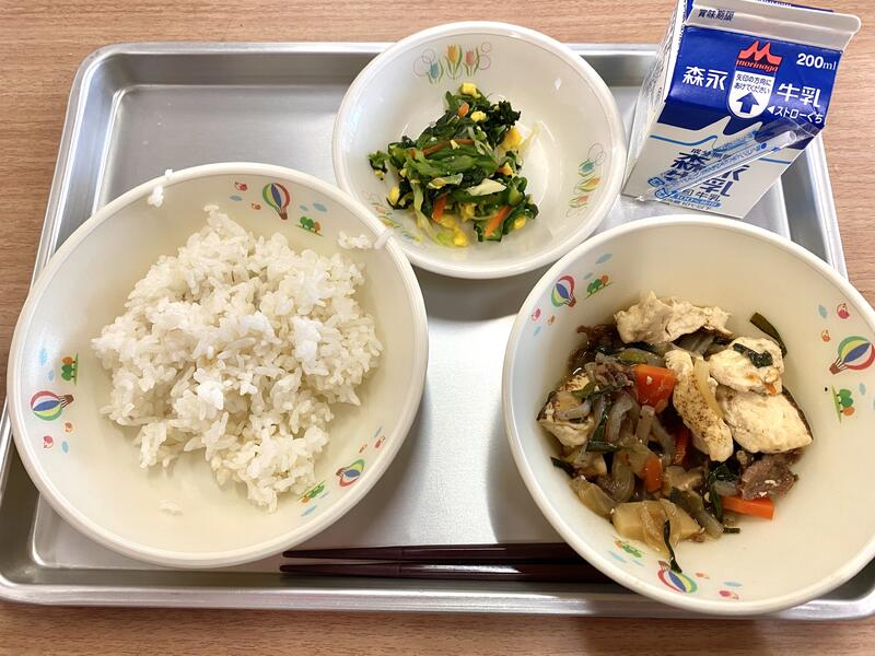 今日の給食は、麦ごはん、牛乳、チャーチャン豆腐、にんじんシュウマイ、もやしのナムルでした。