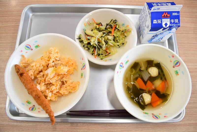 今日の給食は、キムタクごはん(キムチと沢庵の混ぜご飯)、牛乳、はんぺん汁、ししゃもフライ(1び)、いそあえでした。