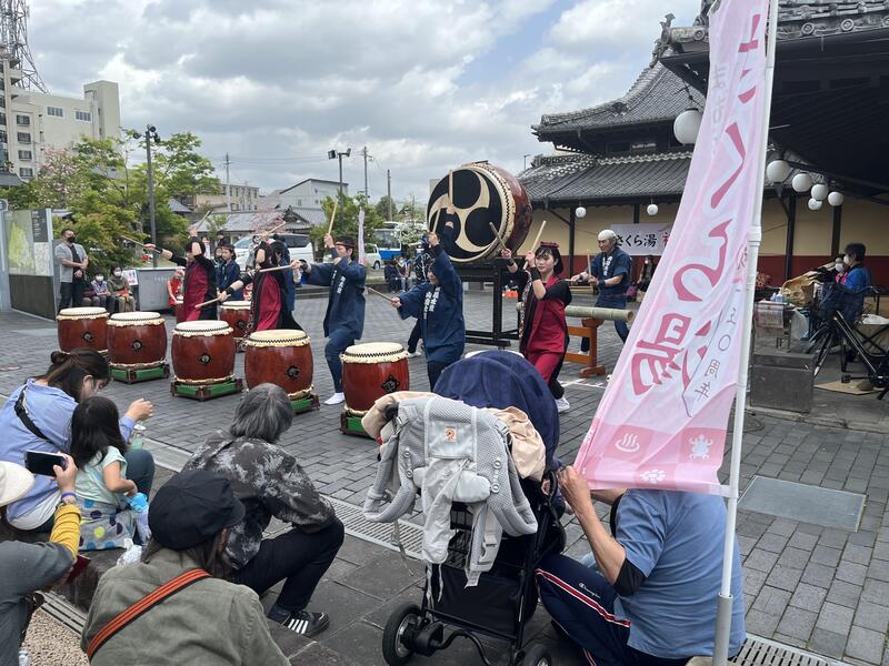 ◎4月16日(日)心配されたお天気もよくなり、温泉祭のオープニングが行われました。山鹿太鼓保存会の皆様とのコラボで45分間の太鼓演奏、山小部隊も頑張りました。何より、恩師中満様、鹿子木様とのコラボ演奏の夢が叶ったことに心から感動しました。