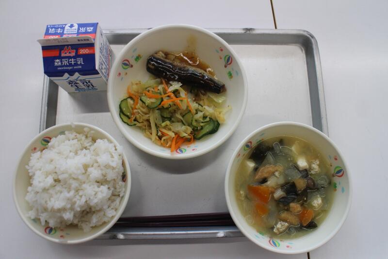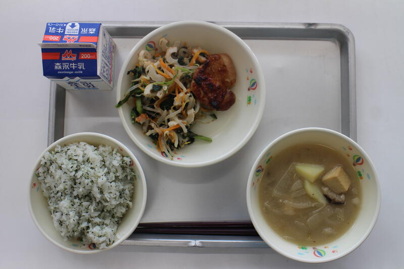 きょうの献立は、むぎごはん、さかなのにんにくソースかけ、おかかあえ、みそしるでした。