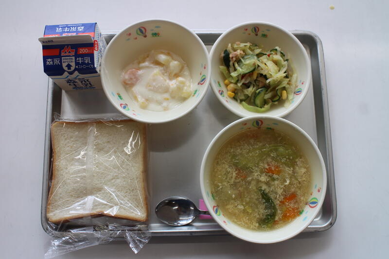 本日の献立は、食パン、たまごとレタスのスープ、ツナサラダ、フルーツヨーグルトでした。