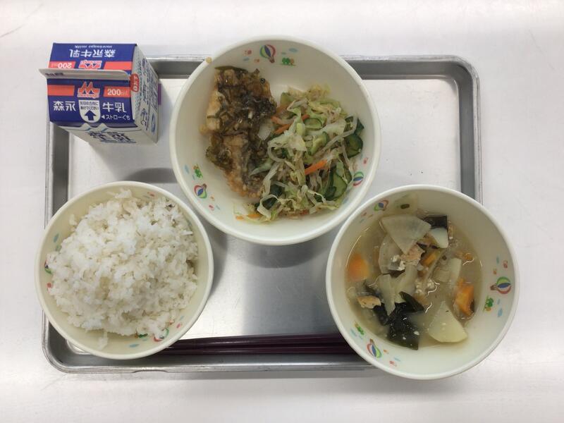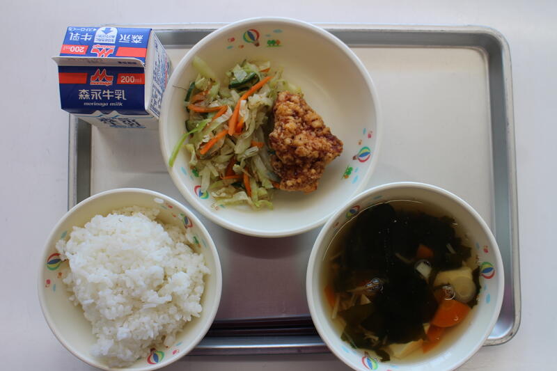 本日の献立は、むぎごはん、とうふのすましじる、とりのからあげ、こんぶのさっぱりあえでした。