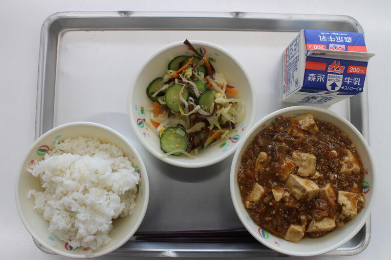 きょうの献立は、むぎごはん、マーボーどうふ、ちゅうかあえでした。