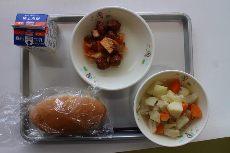 きょうの献立は、コッペパン、はるやさいのポトフ、ミートボールのあまずあんでした。