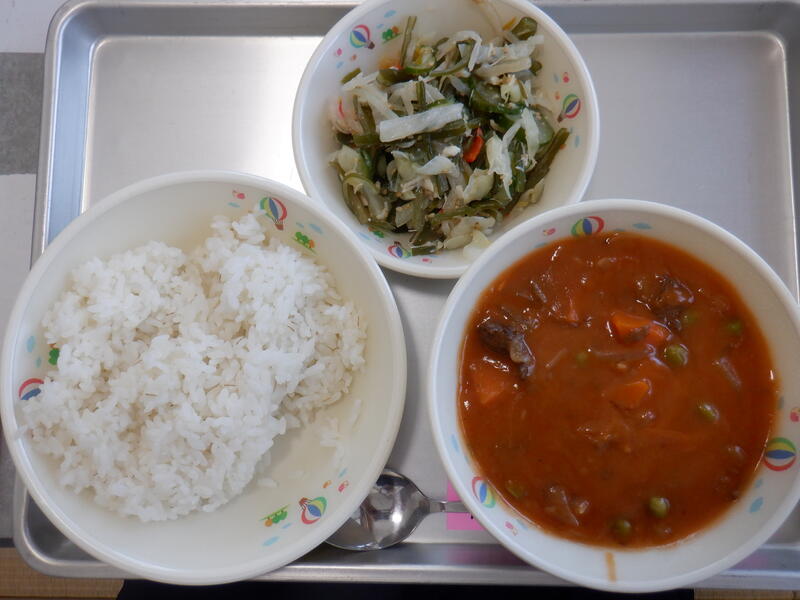 今日の給食はハヤシライス、茎わかめのサラダ、牛乳でした。