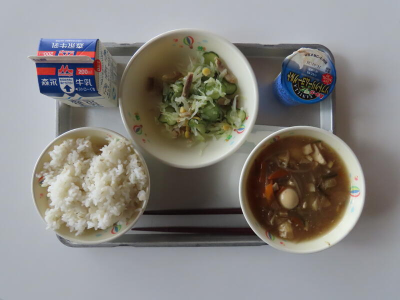 今日の献立は、むぎごはん、とうふとやさいのちゅうかに、ベーコンサラダ、ヨーグルトでした。