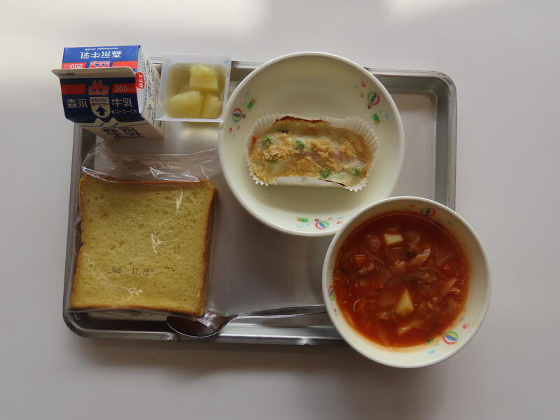 本日の献立は、こめこいりかぼちゃパン、ミネストローネ、さけのグラタン、手づくりデザートでした。