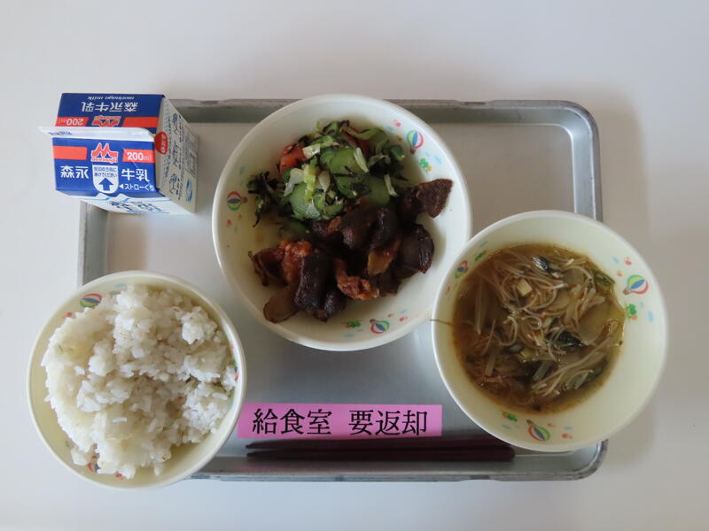 本日の献立は、むぎごはん、ピリからしるビーフン、レバーとゴボウのあげがらめ、チョレギサラダでした。