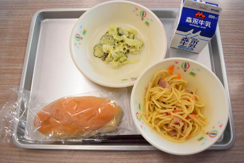 今日の給食は、ミルクパン、牛乳、きのこスパゲッティー、コールスローサラダでした。