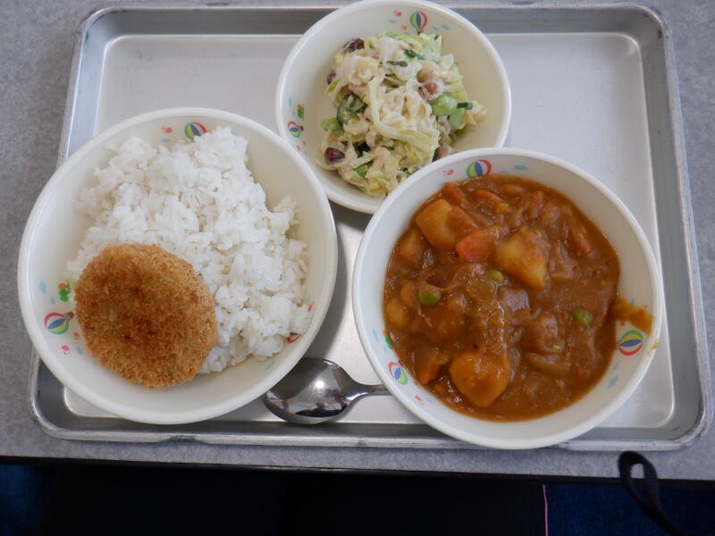 今日の給食はポークカレー、メンチカツ、ビーンズサラダ、牛乳でした。
