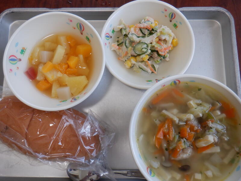 今日の給食はコッペパン、高野豆腐のスープ、ツナサラダ、フルーツポンチ、牛乳でした。