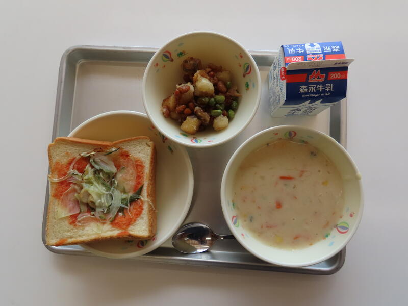 今日の献立は、ピザトースト、コーンチャウダー、ホキとまめのあげがらめでした。