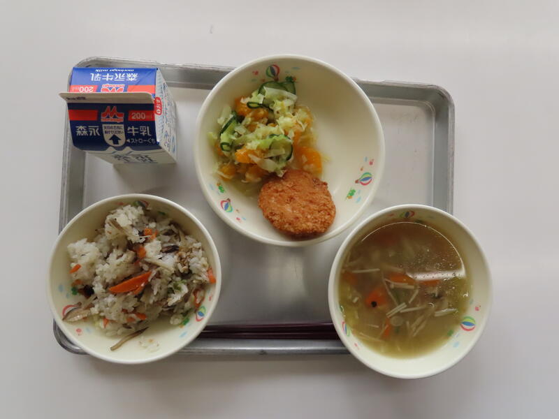 きょうの献立は、びりんめし、しらたまいりきのこじる、れんこんのはさみあげ、みかんサラダでした。