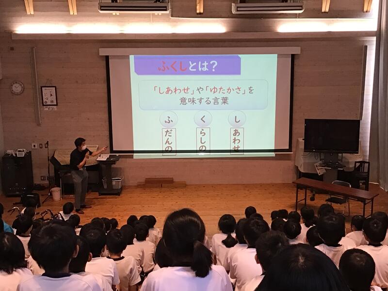 1学期に見事な山鹿総太鼓を完成させた4年生、2学期の総合的な学習のテーマは「福祉」。学年のテーマが「みんなで創ろう優しい山鹿の町」!素敵な学習がスタートしました。初回は、社会福祉協議会の皆様を招いて、「福祉」の理解をしました。福祉とは「ふだんのくらしのしあわせ」ということで私も凄く勉強になりました。