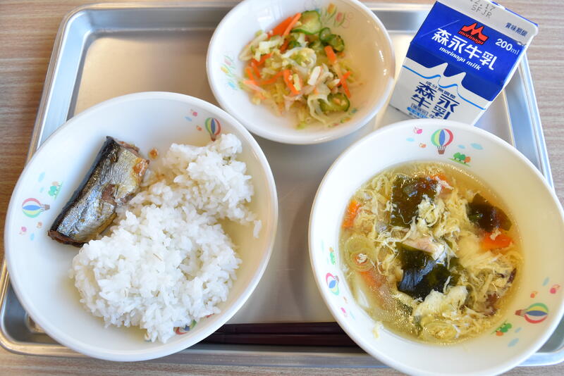 今日の給食は、麦ごはん、牛乳、かきたま汁、サンマのおかか煮、、ミックスナッツ和えでした。