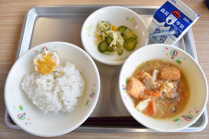 今日の給食は、麦ごはん、牛乳、豚汁、鶏の塩こうじ焼き、高菜和えでした。