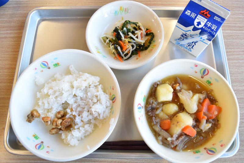 今日の給食は、麦ごはん、牛乳、肉じゃが、ごまずあえ、てっかみそでした。