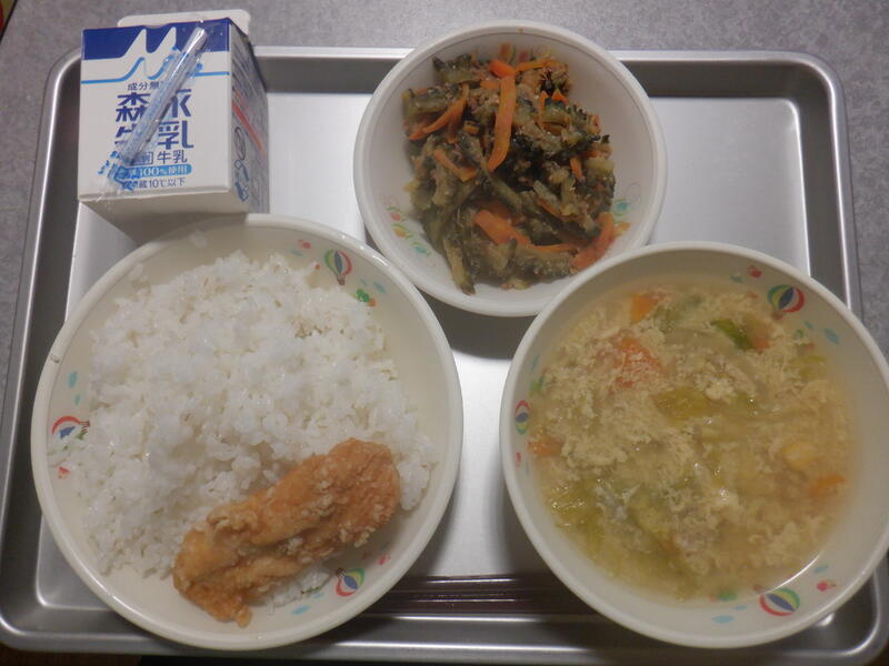 今日の給食は麦ごはん、レタスと卵のスープ、ささみのレモン漬け、にがうりのひこずり、牛乳でした。